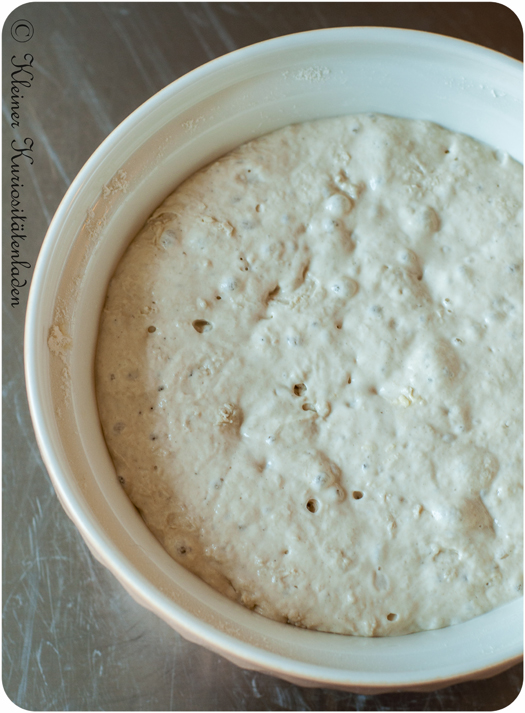 Auf die Schüssel stelle ich einfach einen großen (Kuchen-)Teller, man kann sie aber auch in einen (selbstverständlich unbenutzten) Müllbeutel stellen und diesen zuknoten, das mache ich bei normalen Hefeteigen gerne.